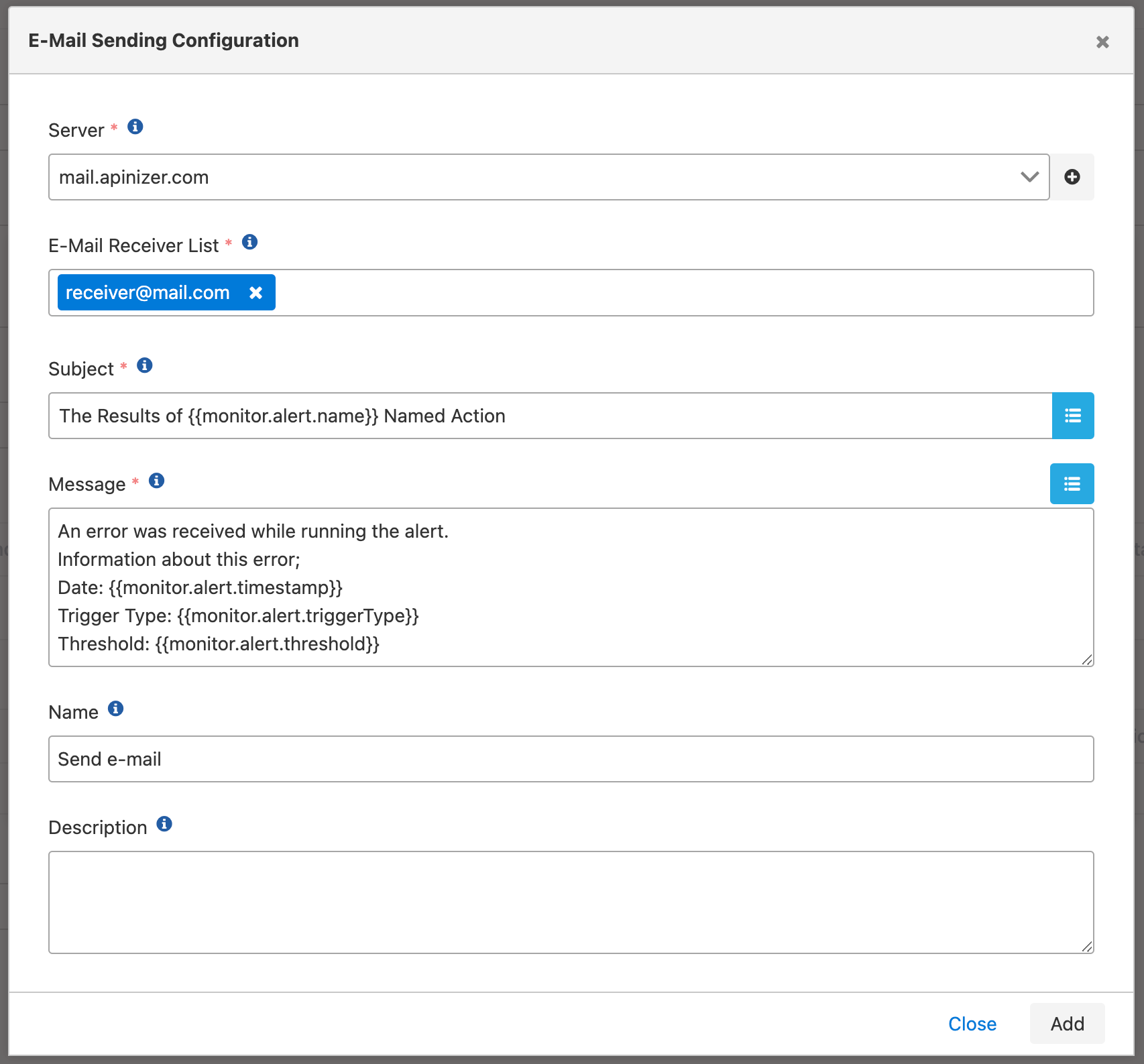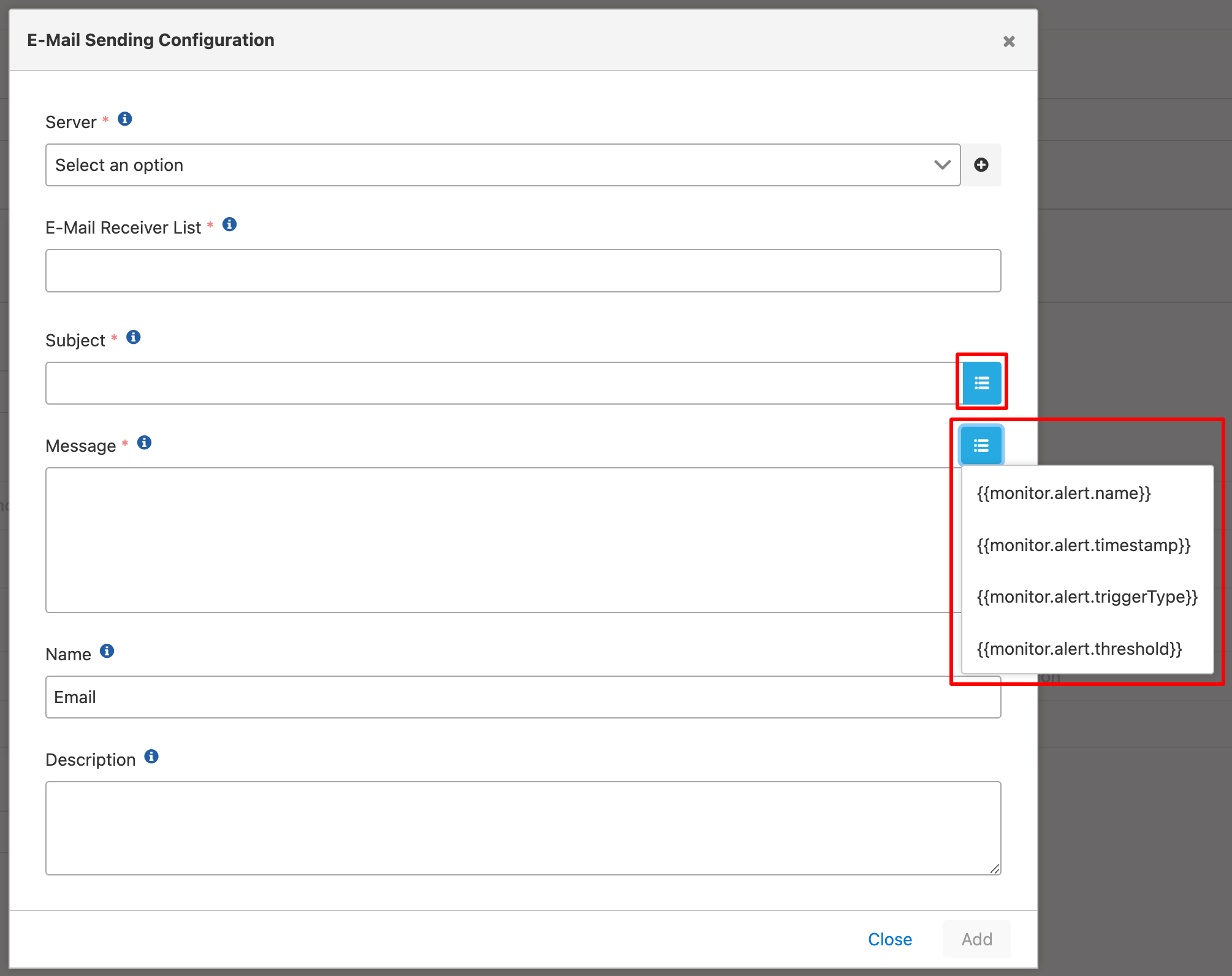 | List of Actionable Variables | In the right panel selected in the image above, there is a list of variables that can be applied according to the job to which the action is added. e.g. Variable usage on email action on Alert screen: