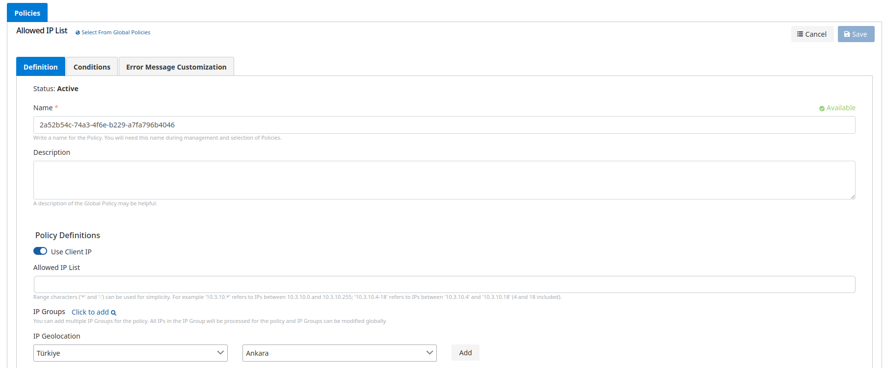 One or more IP Groups can be added to the policy. All IPs in the IP Group are added to the policy.