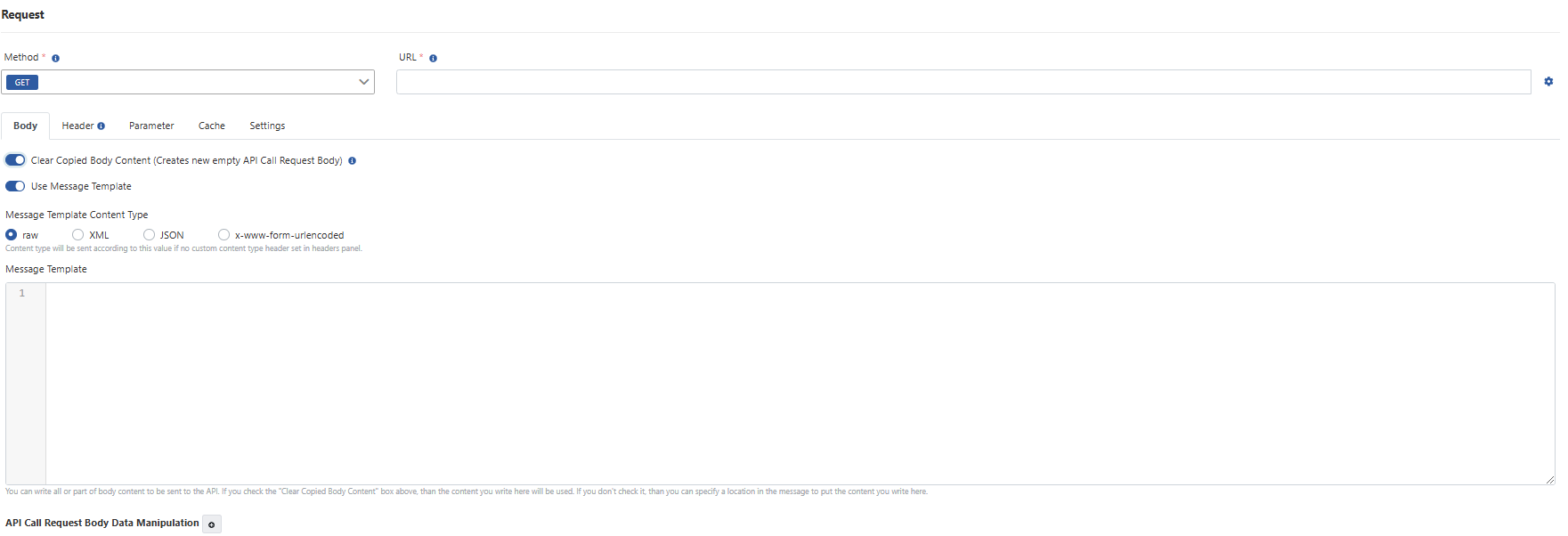 Clear Copied Body Content | This field is used to create the body of the API Call request. If this option is not active, normally the incoming message content in the stream is sent to the endpoint as is. If this option is active, the message body copied from the original message is cleared and the new message body is sent. |
