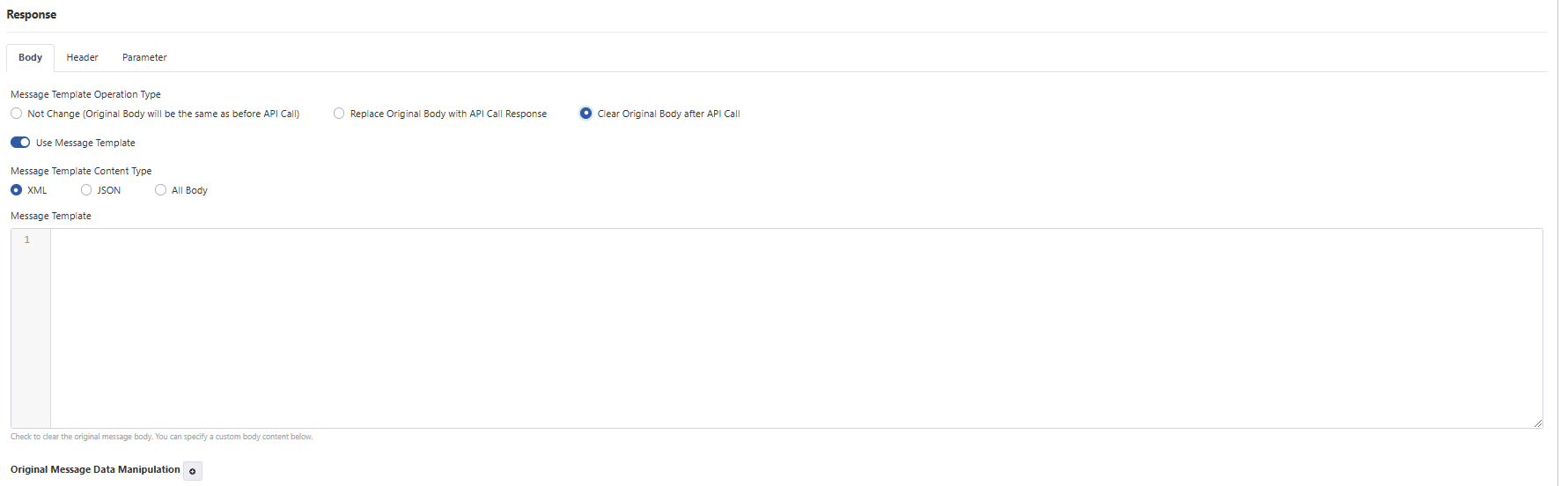 Use Message Template | This field appears when the Clear Original Body after API Call option is activated. If you want to create a new message body of the original message body, it is activated. |