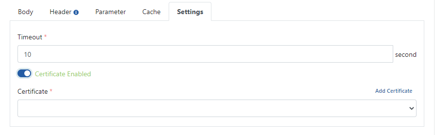 Certificate | This field is required if the certificate has been activated. If there is no desired value in the certificate list, a new one can be created from the Add Certificate link. |