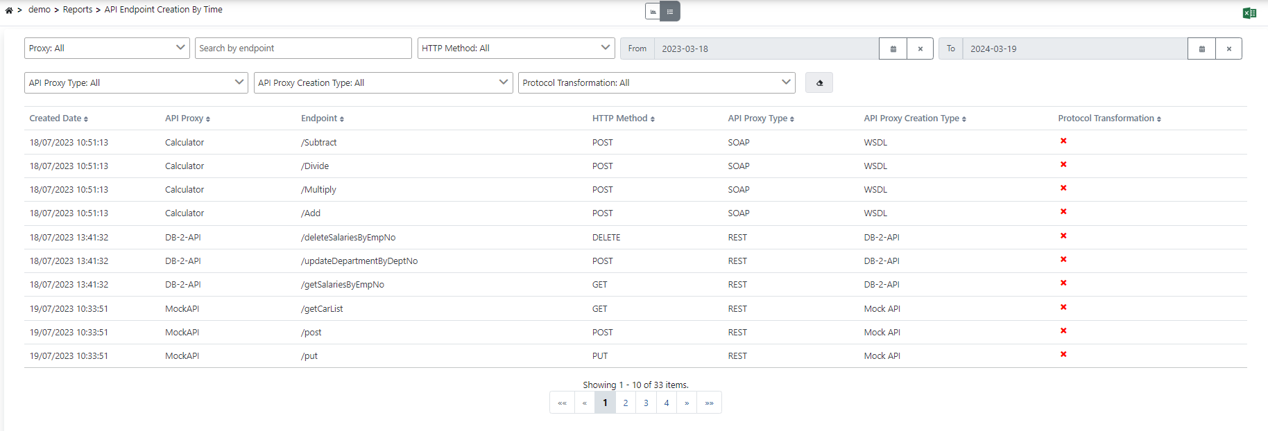 The graphical view gives the information of how many API Endpoint were created monthly in the date range determined from the filters, graphically.
