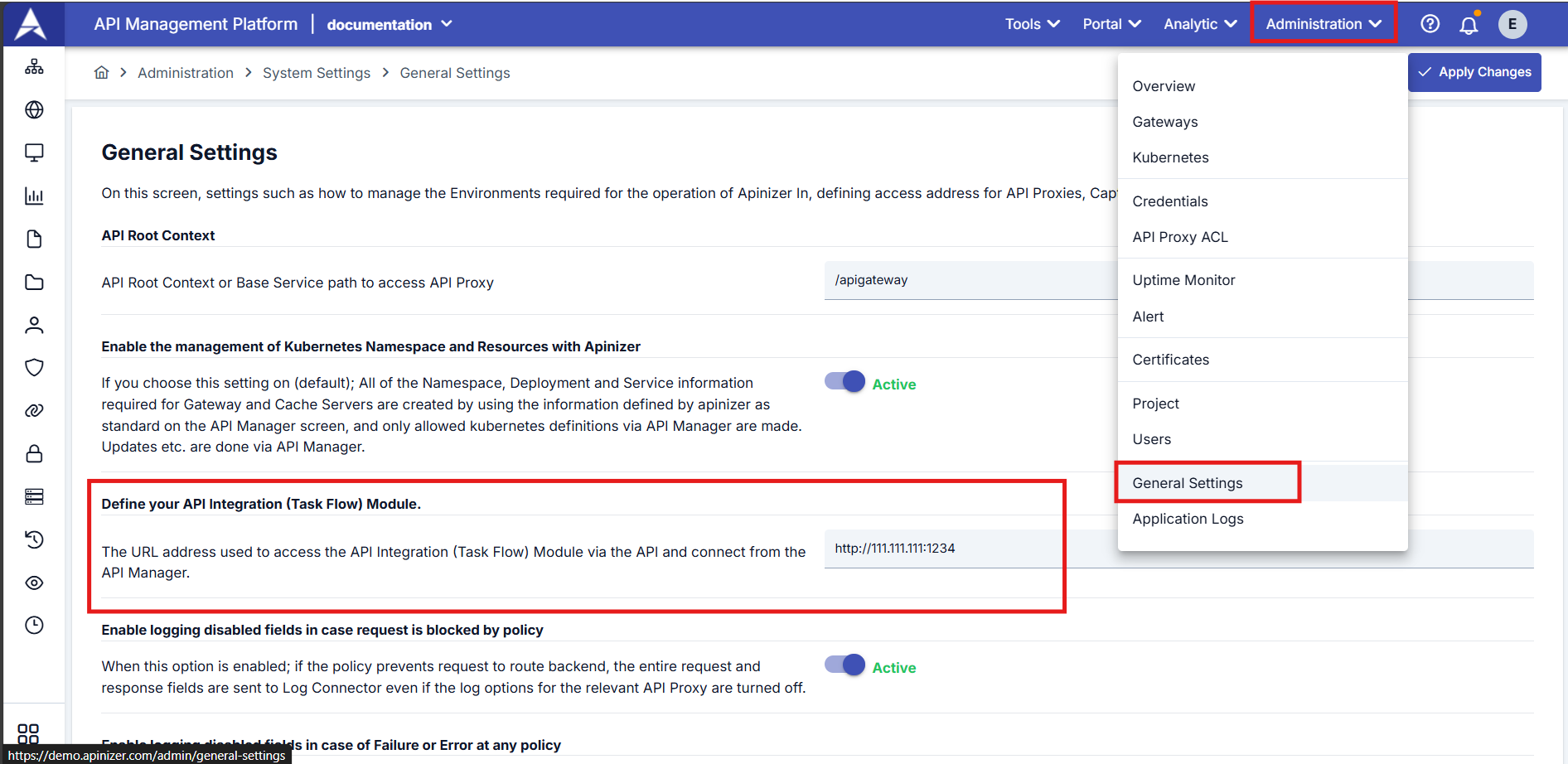 To use the API Integrator, you must enter the integrator's access address information in the Define Your API Integration Module field on the General Settings page under the Administration tab in the top navigation bar.