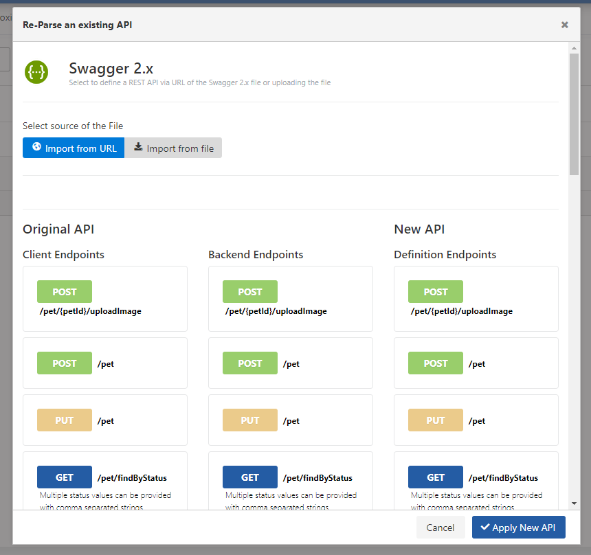 If the Apply New API button is clicked, the settings on the original API Proxy are moved over the new API Proxy to be created by reparsing, and the newly created API Proxy replaces the original one.