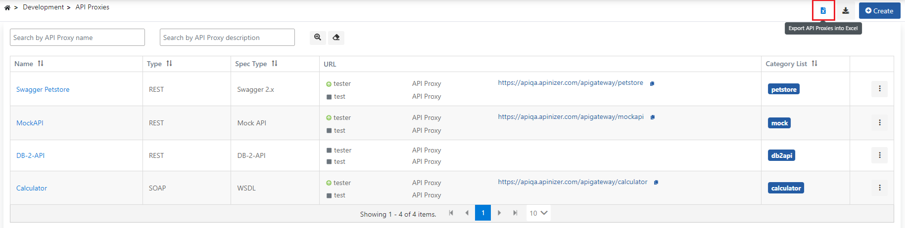 API Proxies displayed in the interface can be downloaded as an Excel file, containing only the filtered elements if a filter is available. For this, it is sufficient to click on the Excel icon in the upper right corner of the interface.