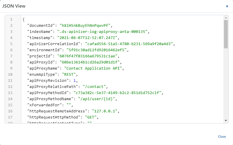 When the JSON View button on the right side of the record is pressed, the JSON version of the log record is displayed.