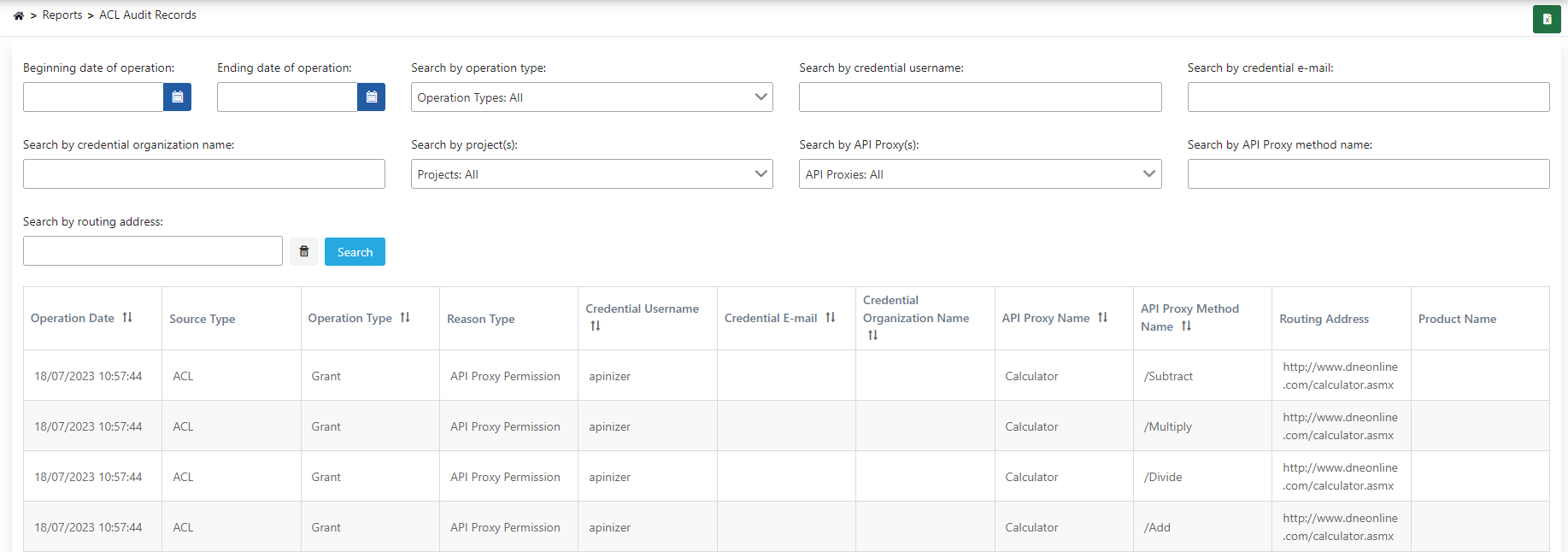 ACL Denetim Kayıtları, API Proxy'ye ya da API Proxy Grup'a erişim için onay verilen ya da reddedilen kullanıcı bilgileri (credential) işlemlerine ait kayıtların görüntülenmesini sağlar. İşlem tarihi, işlem tipi, sebebi, hangi kullanıcı için geçerli olduğu, hangi API Proxy/API Proxy Grup ve metot için geçerli olduğu gibi bilgiler listelenir.