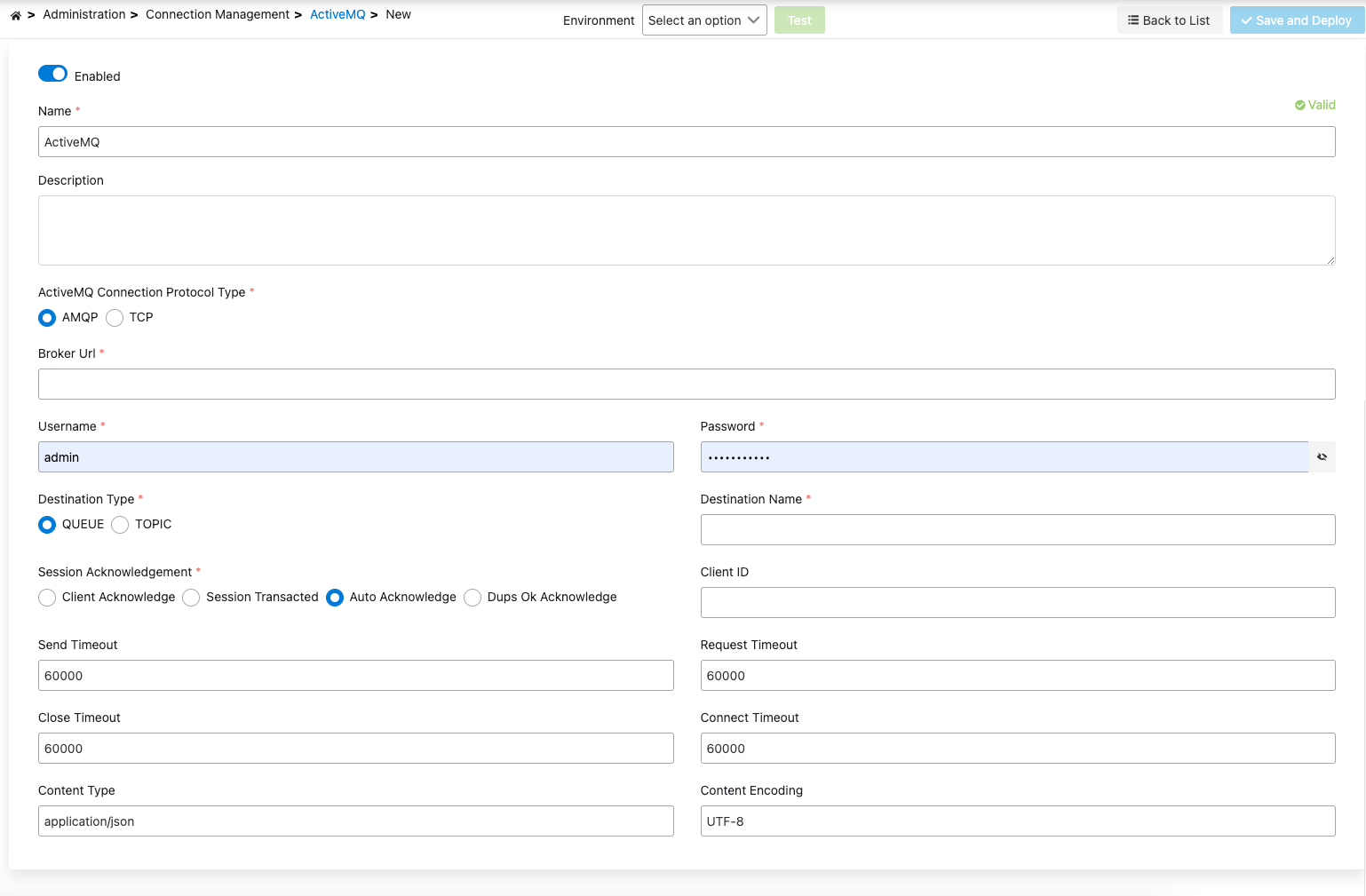 | İstek Zaman Aşımı Süresi (Request Timeout) | Bağlantı tipi AMQP ise istek zaman aşımı değerini belirtir. Eğer bağlantı tipi TCP seçilmiş ise Broker URL değerine "requestTimeout" parametresi olarak eklenmelidir. |