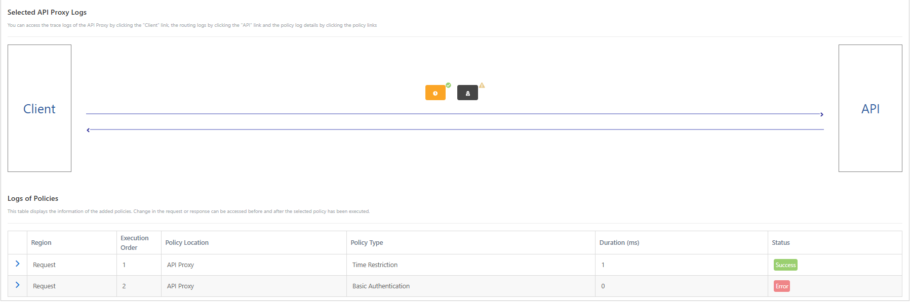 Bu tuşa tıklandığında log kayıtlarını içeren tablonun altında yeni bir bölüm açılır. Bu bölüm, seçilen mesaj için işletilen, varsa API Proxy Gruptan da gelen bütün politikaları işletildikleri sırada gösterir.