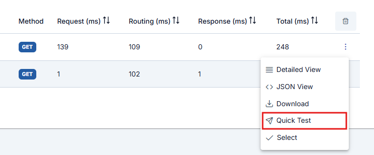İlgili satırdaki Hızlı Test (Quick Test) tuşu, gönderilen isteğin yeniden gönderilerek anında test edilebileceği şekilde biçimlendirilmiş olarak Test Konsolunu açar.