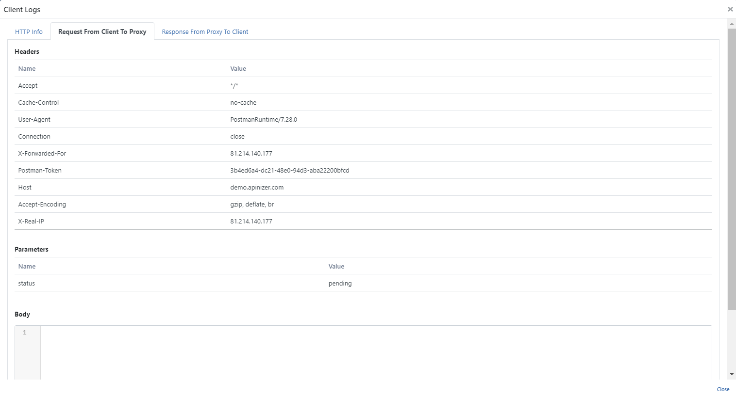 İkinci sekmede istemciden API Proxy'e gönderilen mesajın detayları bulunur.