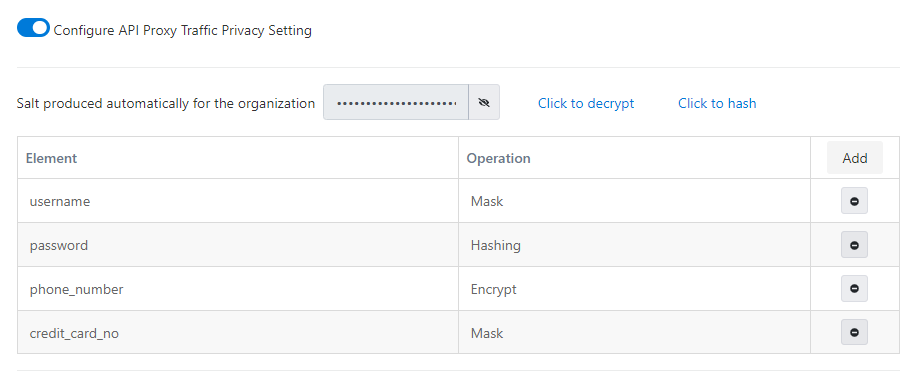 API Proxy Trafik Gizlilik Ayarları ilk aktif hale getirildiğinde Apinizer bir tane salt değeri oluşturur ve verileri bununla hashler.