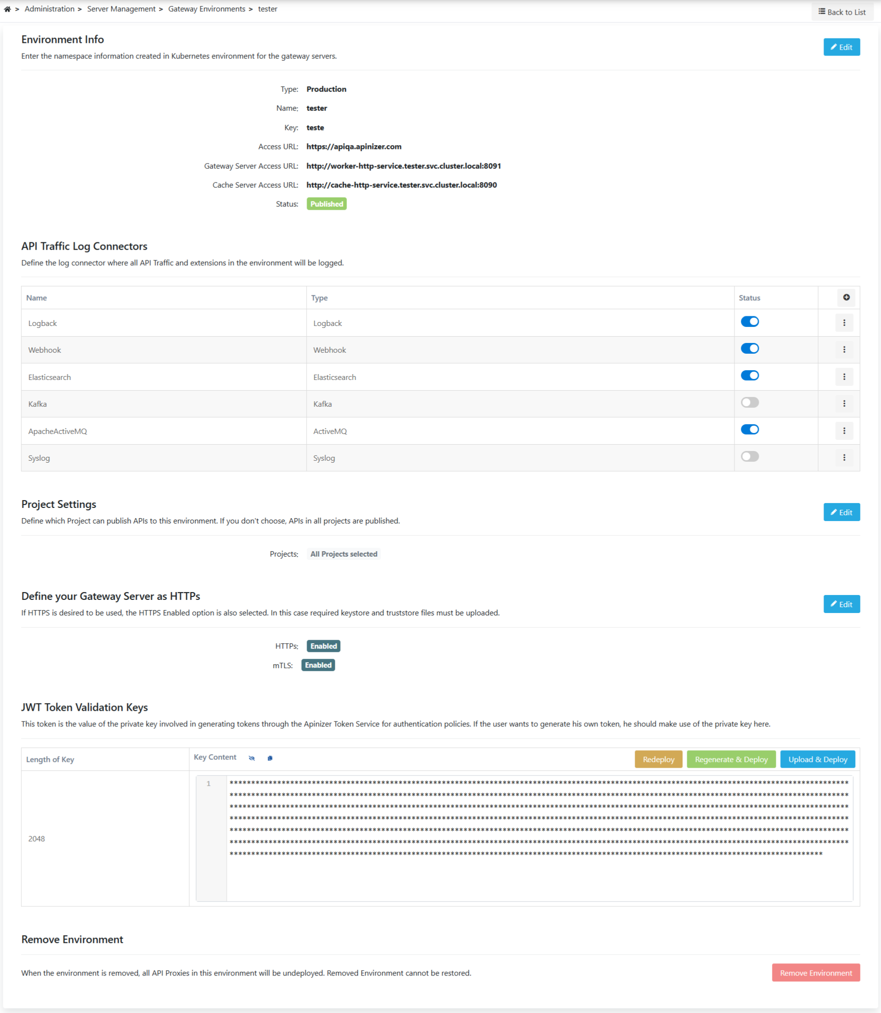 API Proxy Trafik Log Konnektörleri (API Traffic Log Connectors) | Ortamdaki tüm API Proxy Trafiğinin ve uzantılarının loglanacağı log konnektörleri buradan tanımlanır. Ortama konnektör ekleme hakkında daha fazla bilgi için lütfen bu sayfaya bakın. |