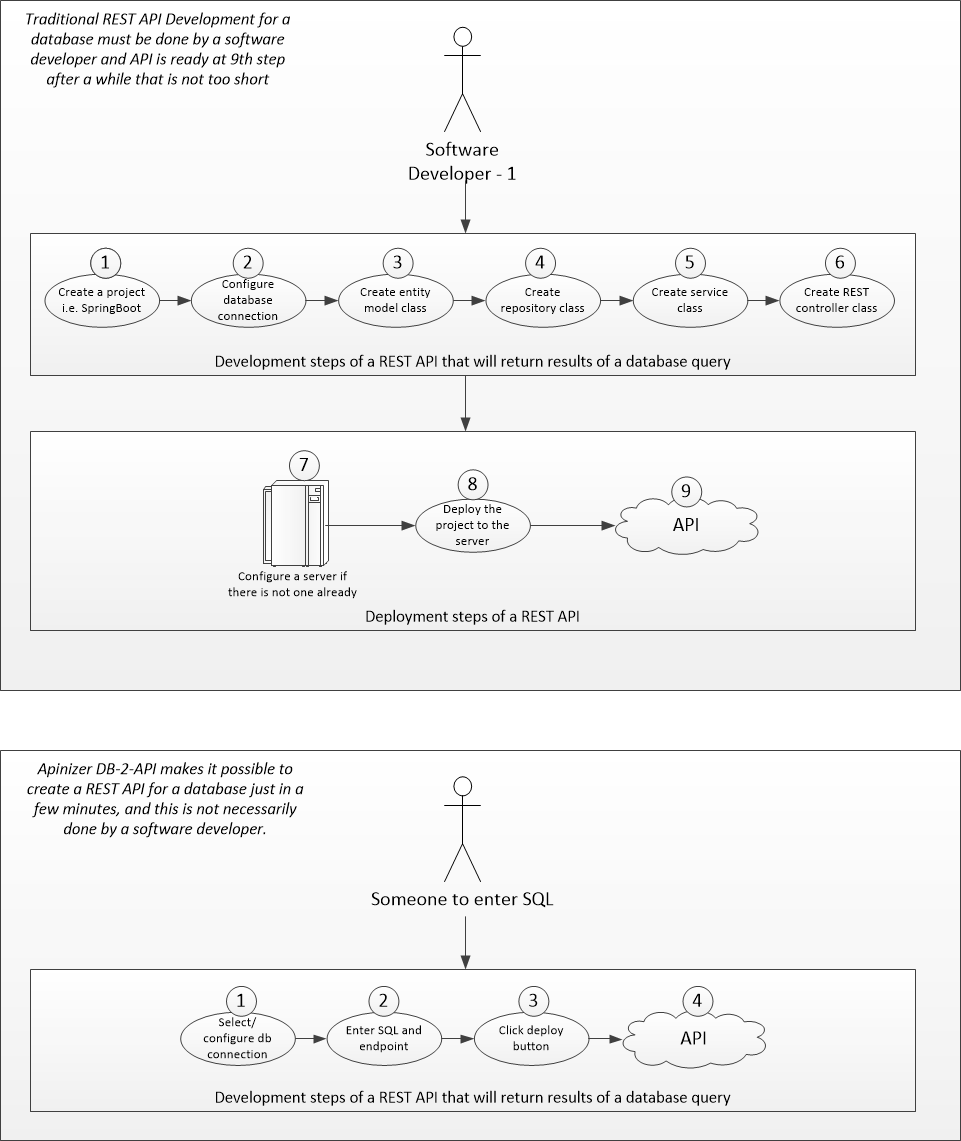 DB-2-API'nin veri tabanı işlemleri için API açma süresini nasıl kolaylaştırıp kısalttığı aşağıdaki şekilde görülmektedir:
