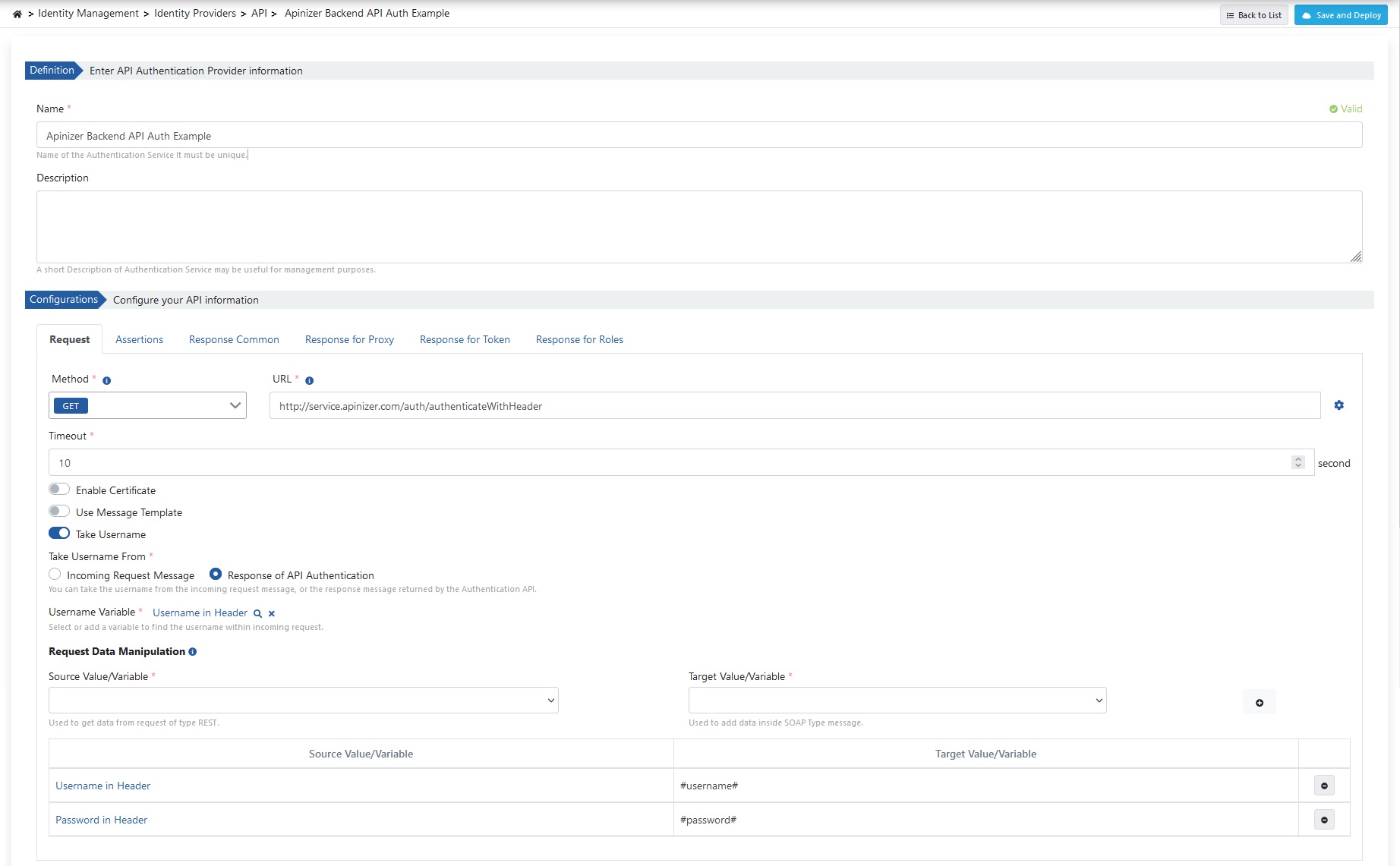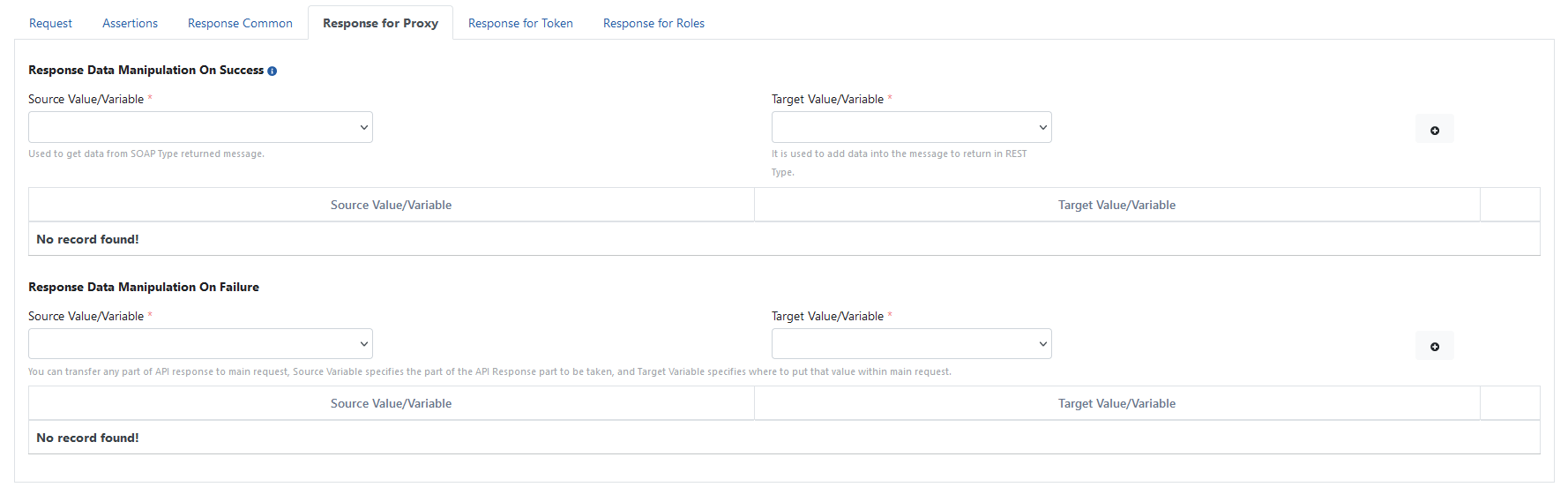 İstek Verisi Düzenlemesi (Request Data Manipulation) | Gelen isteğin istediğiniz bölümlerini, kimlik doğrulaması yapacak olan API'ye gönderilen istek mesajının içine taşıyabilirsiniz. Kaynak Değişken, gelen mesajın hangi bölümünün alınacağını, Hedef Değişken ise bu bilginin API'ye gönderilecek mesajın neresine koyulacağını belirtir. | |