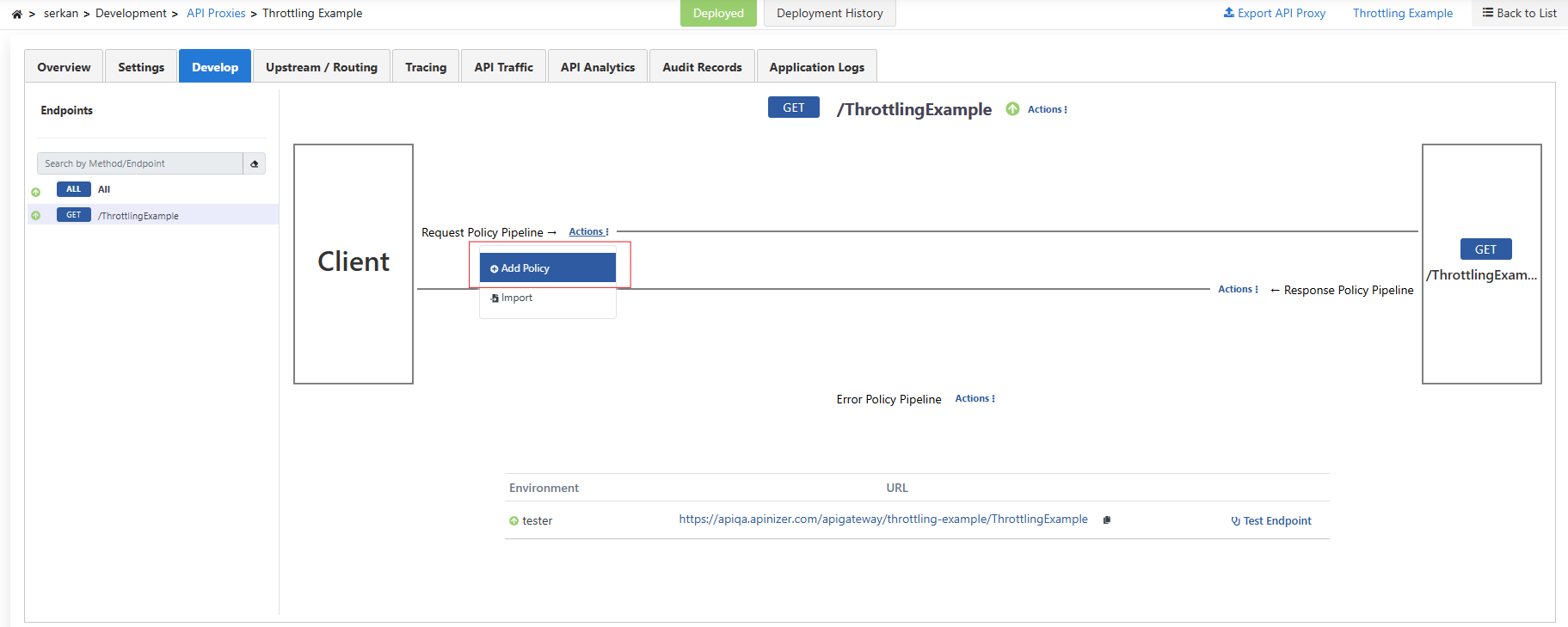 Bu senaryoda Apinizer üzerinde oluşturulan Mock API'ye API Based Throttling politikasının uygulanması test edilecektir.