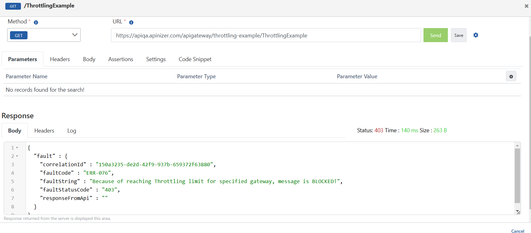 Test konsolundan örnek istek attığımızda, mevcut zamanda saat 14:00:00 ve 14:04:59 zaman aralığında 10. istek sonrasında kısıtlama sınırına ulaşıldığı için, mesaj engellendi.