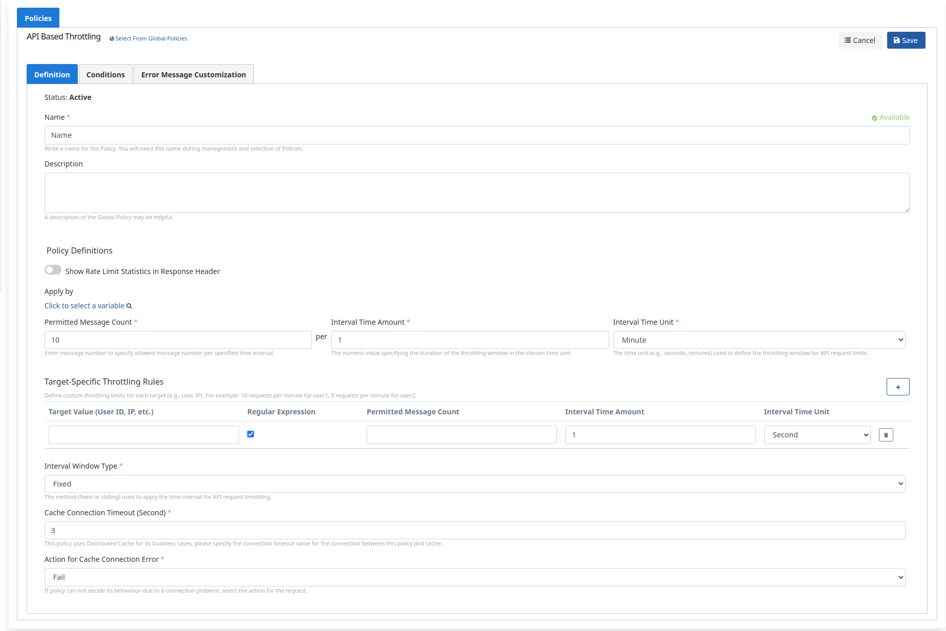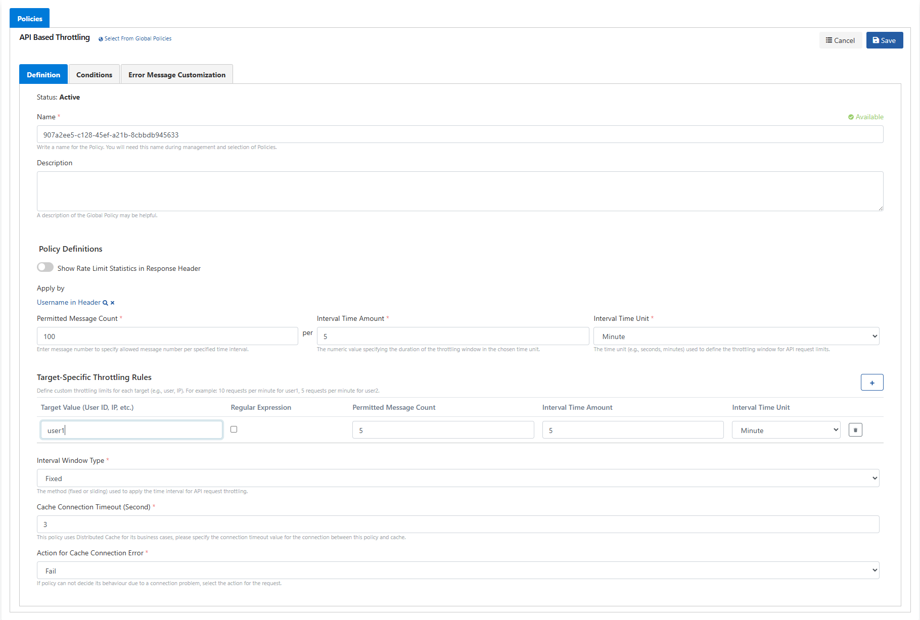 Cache ile bağlantı problemi yaşanırsa, hata döndürmesi (Fail seçilir) veya istek kısıtı uygulanmadan devam etmesi (Continue seçilir) durumu belirlenir. |
