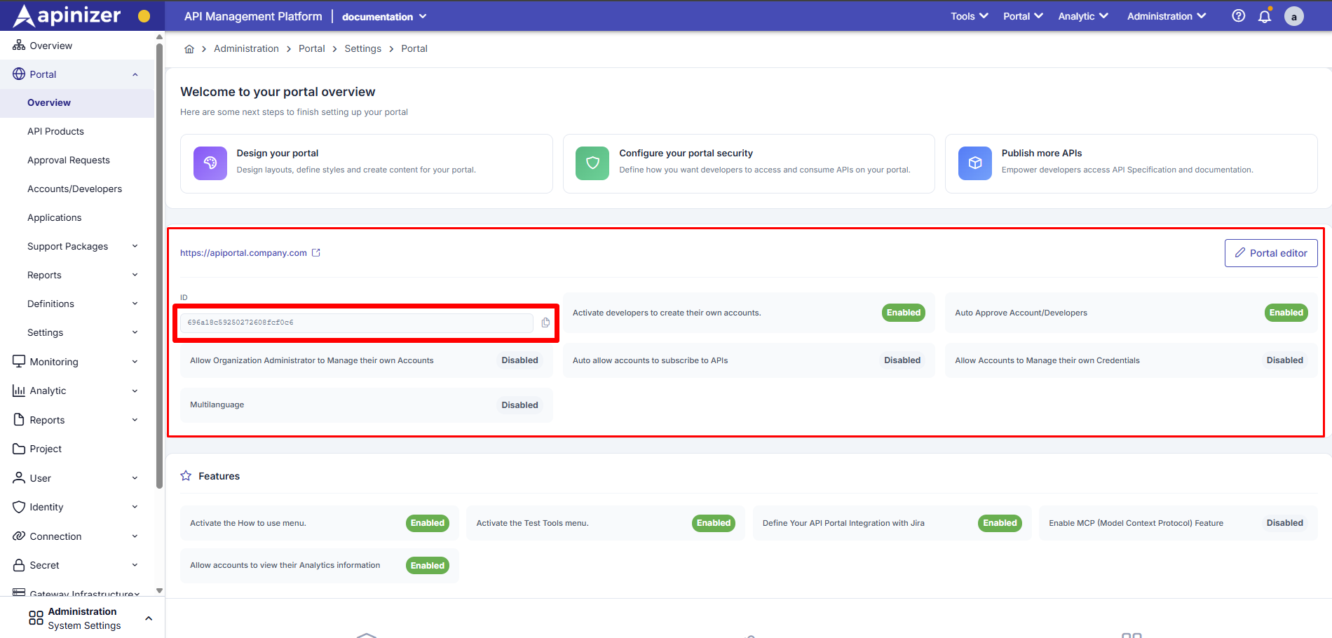 Portal ID'yi Administration > Portal > Settings > Portal'de ID'yi aşağıdaki işaretli yerden alabilirsiniz.
