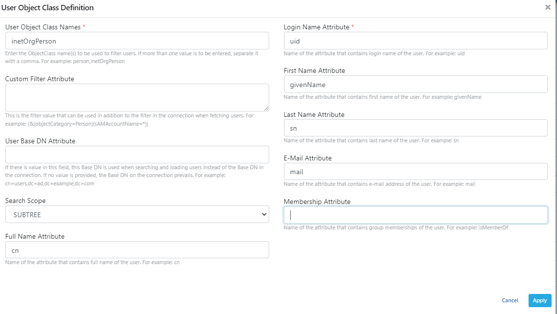 Yukarıdaki örnek görseldeki User için ilgili alanların nasıl doldurabileceğini, mevcut LDAP uygulamanıza bağlanarak görüntüleyebilirsiniz.