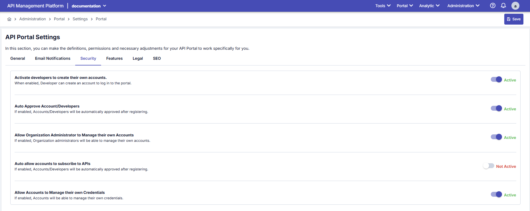 | Geliştiricilerin kendi hesaplarını oluşturmalarını etkinleştirin (Activate developers to create their own accounts) | Security sekmesi → Enable Account Register Portal'a yeni kullanıcı kaydını açmak veya kapatmak, Self-service kayıt özelliğini kontrol etmek amamcı ile kullanılır. Aktif olması durumunda Kullanıcılar portal'a kendi kendilerine kayıt olabilir, "Kayıt Ol" butonu görünür, Kayıt formu erişilebilir. | Portal giriş sayfasındaki “Sign Up/Register” butonunun görünürlüğünü belirler; pasifse self-signup kapalıdır. |