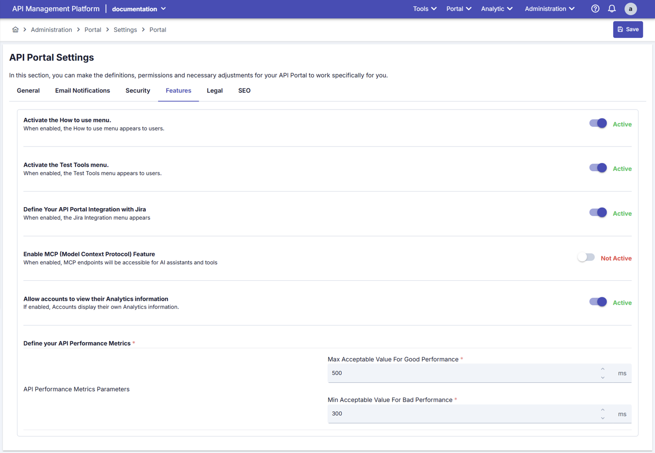API Developer Portal tarafında kullanılacak olan özellikler, bu ekran üzerinden yönetilir.