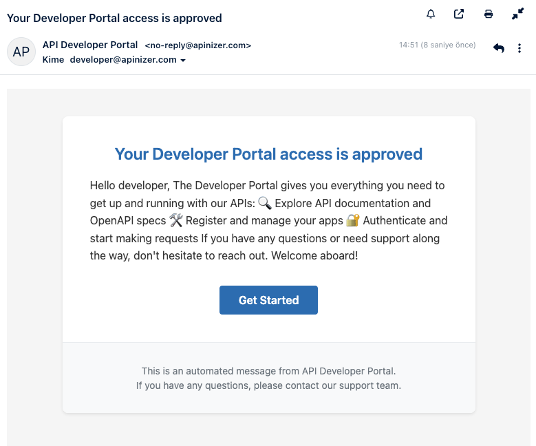 Hoş Geldiniz | Kullanıcının hesabı onaylandığında Yönetici tarafından manuel onay sonrası veya otomatik onay durumunda | Kullanıcıya hesabının aktif olduğunu bildirir Portal'a giriş yapabilir hale geldiğini söyler | ADIM 1:Kullanıcı E-postasını Onaylamıştır, Kullanıcı "Confirm Email Address" mailindeki linke tıklamış, E-posta adresi doğrulanmış ADIM 2: Hesap Onaylanır (İki Senaryo), [SENARYO 1: Auto Approve Account = AKTIF], Hesap otomatik olarak onaylanır,"Welcome" e-postası anında gönderilir [SENARYO 2: Auto Approve Account = PASIF], Yönetici bildirim alır, Yönetici Manager'a girer, Portal Management → Developer Accounts bölümüne gider, Bekleyen kullanıcıyı görür, [Approve] butonuna tıklar, "Welcome" e-postası gönderilir ADIM 3: Kullanıcı E-postayı Alır, Subject: Ayarladığınız konu,Title: Ayarladığınız başlık, Body: Ayarladığınız içerik, Buton: Ayarladığınız buton metni (örn: "Portal'a Git") ADIM 4: Kullanıcı Portal'a Erişebilir, Artık portal'a giriş yapabilir, API'leri inceleyebilir, Uygulama kaydı yapabilir |
