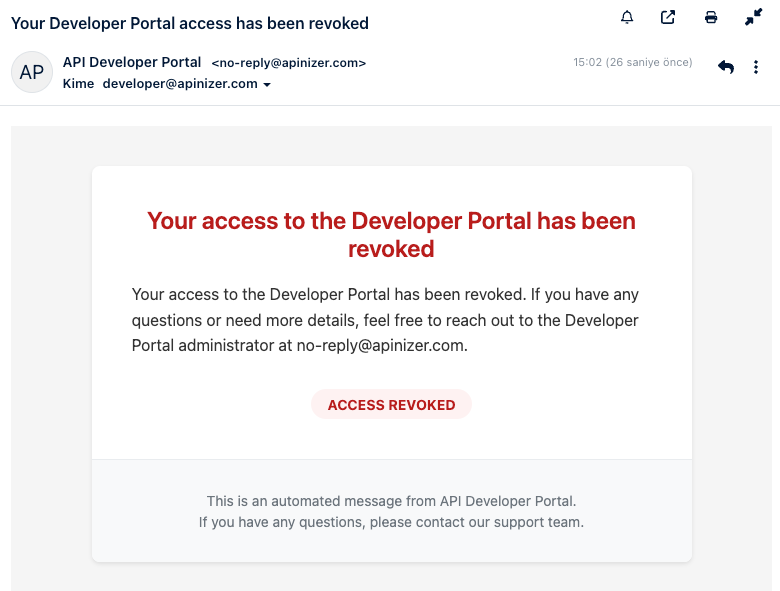 Hesap Erişimi İptal Edildi | Daha önce aktif olan bir kullanıcının erişimi iptal edildiğinde Yönetici tarafından kullanıcı devre dışı bırakıldığında Güvenlik veya politika ihlali durumunda | Kullanıcı artık portal'a giriş yapamaz Mevcut oturumlar kapatılır API key'ler devre dışı bırakılır | ADIM 1:Kullanıcı Aktif Bir Hesaba Sahiptir, Kullanıcı daha önce onaylanmış, Portal'ı aktif olarak kullanıyor, API'lere erişimi var ADIM 2: İptal Nedeni Oluşur, Güvenlik ihlali tespit edilir, Kullanım politikası ihlal edilir, Sözleşme/üyelik sona erer, Manuel yönetici kararı ADIM 3: Yönetici Erişimi İptal Eder, Yönetici Manager'a girer, Portal Management → Developer Accounts bölümüne gider, İlgili kullanıcıyı bulur, [Revoke Access] seçer, İptal nedenini girer (opsiyonel), Onaylar ADIM 4: Sistem İşlemi Gerçekleştirir, Kullanıcı hesabı anında devre dışı bırakılır, Tüm aktif oturumlar kapatılır, API key'ler pasif edilir, "Account Access Rejected" e-postası gönderilir ADIM 5: Kullanıcı E-postayı Alır, Subject: Ayarladığınız konu, Title: Ayarladığınız başlık, Body: Ayarladığınız içerik. ADIM 6: Kullanıcı Etkileri, Hemen çıkış yapılır (aktif oturum varsa),Tekrar giriş yapamaz, API çağrıları 401 Unauthorized döner,Tüm uygulama kayıtları pasif olur | ![]() |