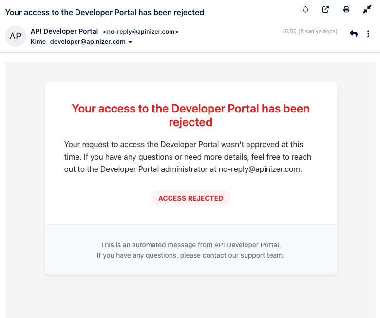 Hesap Erişimi Reddedildi | Yönetici kullanıcının kayıt talebini reddettiğinde Manuel onay sürecinde kullanıcı uygun görülmediğinde | Kullanıcı portal'a giriş yapamaz Hesap oluşturulmaz veya silinir | ADIM 1: Kullanıcı Kayıt Olmuş ve E-posta Onaylamıştır, Kullanıcı portal'a kayıt olmuş, E-posta adresini doğrulamış, Manuel onay bekliyor (Auto Approve Account = PASIF) ADIM 2: Yönetici Talebi İnceler, Yönetici Manager'a girer, Portal Management → Developer Accounts bölümüne gider, "Pending Approval" filtresi ile bekleyen kullanıcıları görür, İlgili kullanıcıyı inceler ADIM 3: Yönetici Talebi Reddeder,[Reject] butonuna tıklar, Red nedeni girerse (opsiyonel), Onaylar ADIM 4: Sistem İşlemi Gerçekleştirir, Kullanıcı hesabı pasif edilir veya silinir, "Account Access Rejected" e-postası gönderilir ADIM 5: Kullanıcı E-postayı Alır, Subject: Ayarladığınız konu, Title: Ayarladığınız başlık, Body: Ayarladığınız içerik. ADIM 6: Kullanıcı Portal'a Erişemez, Giriş yapmaya çalışırsa hata alır, "Your account is not active" mesajı görür | ![]() |
