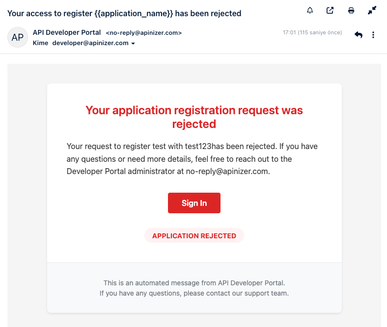 Uygulama Kaydı Reddedildi | Kullanıcının API'ye app kaydı talebi reddedildiğinde Yönetici talebi uygun görmediğinde | Kullanıcı o API'yi kullanamaz API key'ler oluşturulmaz Kullanıcı tekrar başvuru yapabilir | ADIM 1:Kullanıcı API'ye Abone Olma Talebi Yapmıştır, Kullanıcı API'ye subscribe olmuş, Uygulama bilgilerini girmiş, Manuel onay bekliyor (Auto Approve API Subscribe = PASIF) ADIM 2: Yönetici Talebi İnceler, Yönetici Manager'a girer, API Management → Subscriptions bölümüne gider,"Pending Approval" filtresiyle bekleyen talepleri görür ADIM 3: Yönetici Talebi Reddeder,[Reject] seçer, Red nedeni girer (opsiyonel, kullanıcıya gösterilmez), Onaylar ADIM 4: Sistem İşlemi Gerçekleştirir, Subscription talebi reddedildi olarak işaretlenir, API key'ler oluşturulmaz, "App Registration Rejected" e-postası gönderilir ADIM 5: Kullanıcı E-postayı Alır, Subject: Ayarladığınız konu, Title: Ayarladığınız başlık, Body: Ayarladığınız içerik, Buton: Giriş Yap ADIM 6: Kullanıcı Seçenekleri,Portal'da talebin reddedildiğini görür, Farklı bir plan ile tekrar deneyebilir,Destek ile iletişime geçebilir, Başka bir API'ye subscribe olabilir |