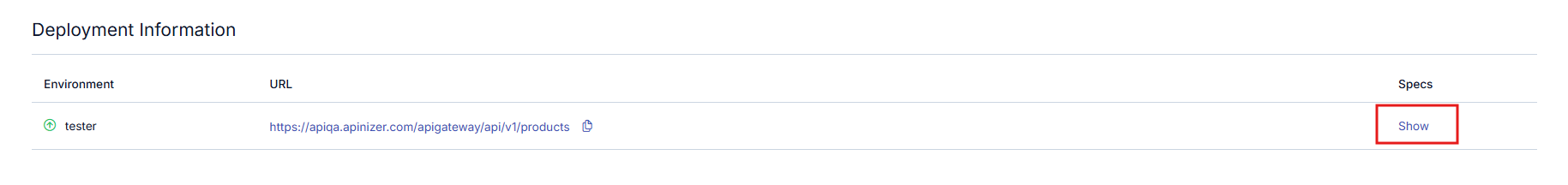 API Proxy Group deploy edildikten sonra Deployment bölümünde ilgili erişim adresine ait Göster (Show) butonu gelir. Bu butona tıklandığında API Proxy Grubun JSON formatındaki Open API specification bilgisine ulaşılır.