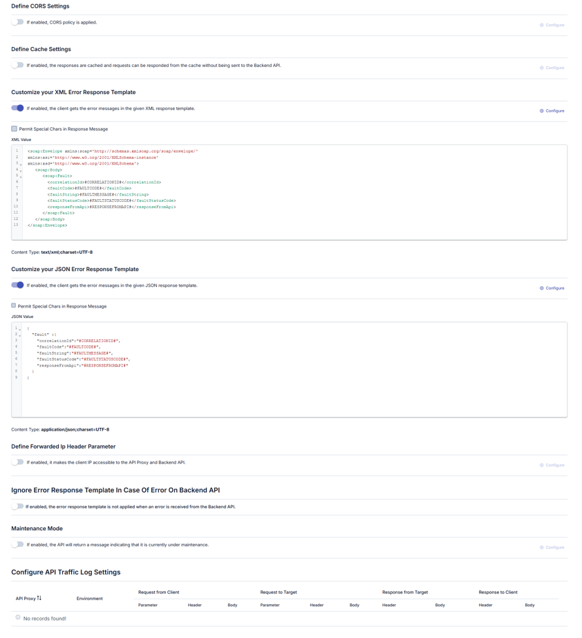 - Ignore Error Response Template: Error response template'in ignore edilmesi ayarı, API Proxy Group bazında ayarlanabilmektedir.