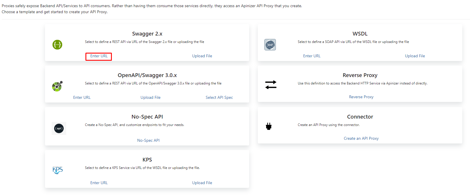 Oluşturulacak API Proxy için uygun olan tip ve seçenek seçilir. Bu örnek için Swagger 2.x tipinin URL Gir (Enter URL) bağlantısına tıklanır.