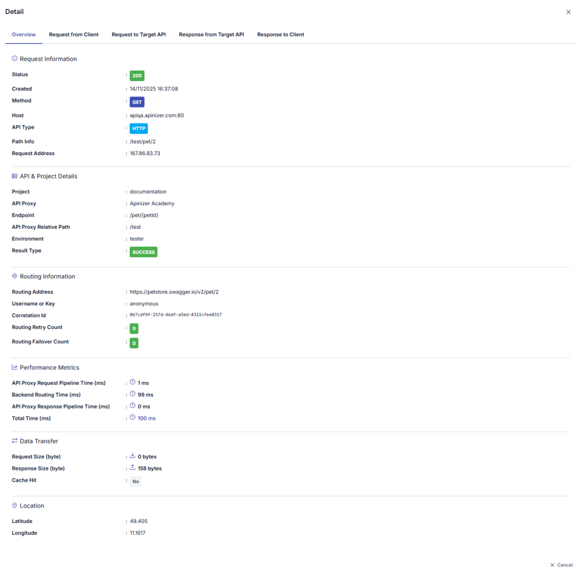 Açılan pencerede, logların mesaj akışına ilişkin bölümlere ayrıldığı görülür. İncelenmek istenen bölümün (örneğin İstemciden API Proxy'e Gelen İstek (Request From Client to API Proxy) bölümünün) adına tıklandığında bu alana ilişkin log kayıtları görüntülenir. Varsayılan olarak Genel Bakış (Overview) bölümü açıktır.
