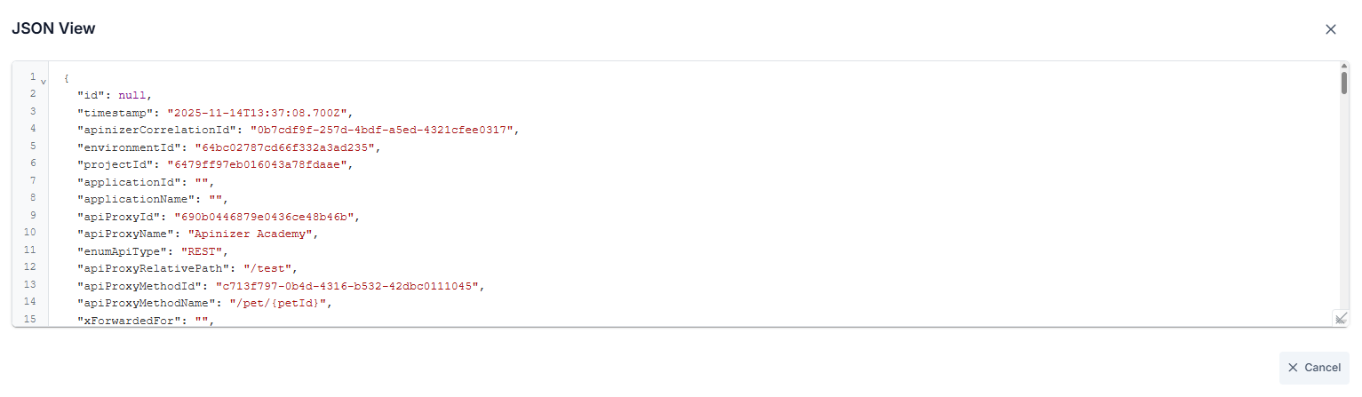 Örneğin "apiProxyId" değeri log kaydında "api" şeklinde tutulmaktadır, log kaydı indirildiğinde esas tutulan log kaydı görüntülenecektir.