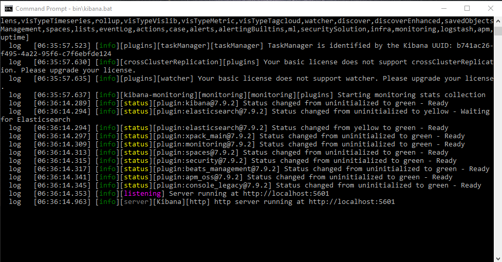 - Kibana'yı başlatmak için .bat uzantısı ile aşağıdaki komut çalıştırılır.