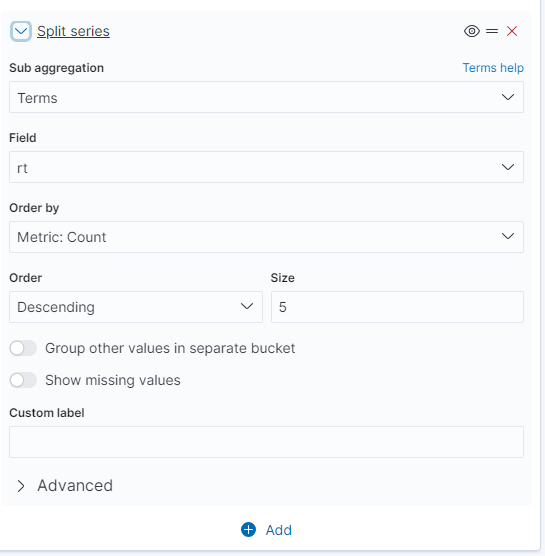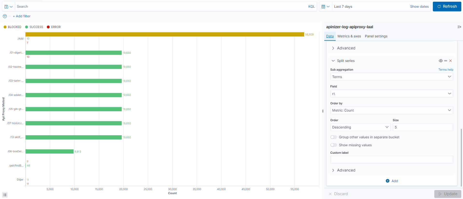 - X ekseni için belirleme yapmak için Buckets alanına apm (API Proxy Method ismi) kullanılır. Sonuçları gruplamak için, sıklıkla karşılaşılan değerlere göre Split Series kısmında Terms terimi kullanılarak durumlar gruplandırılır.