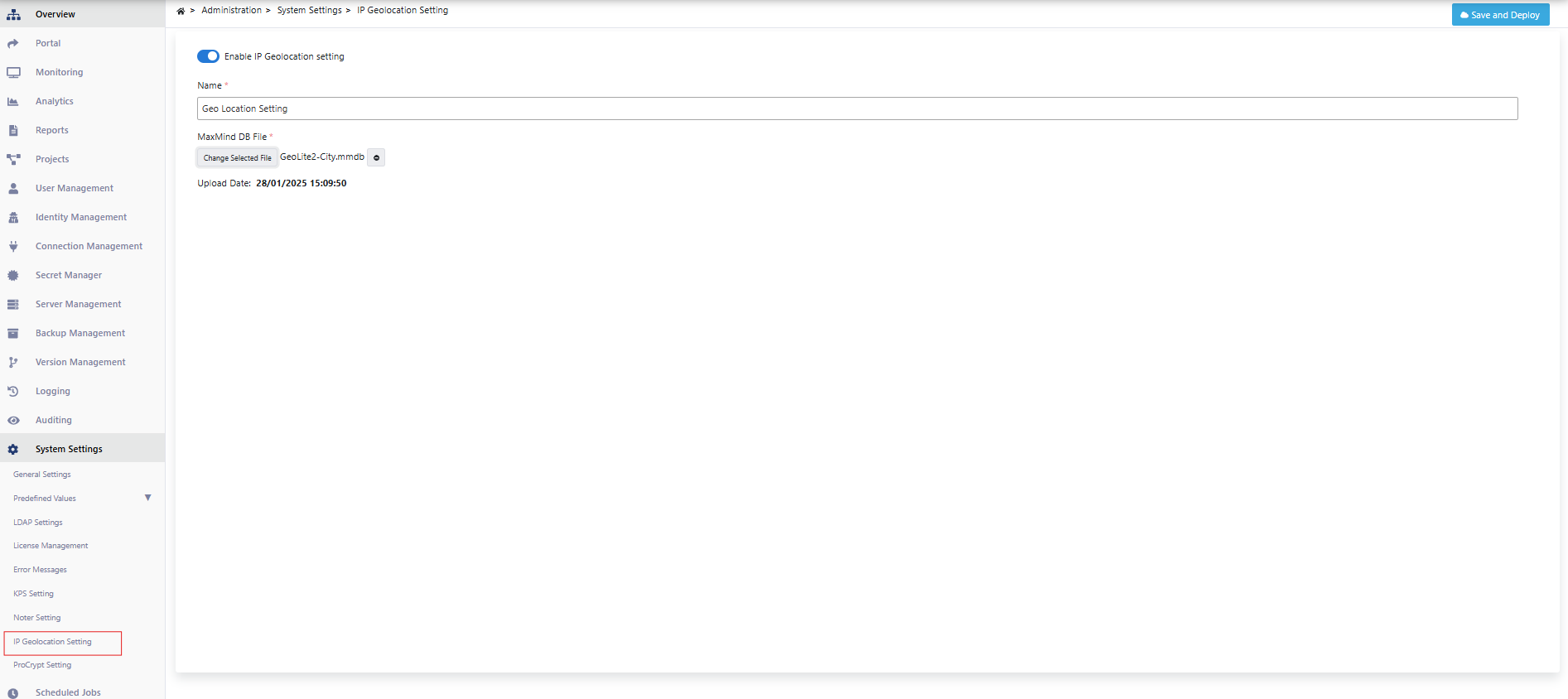 Administration → System Settings → IP Geolocation Setting sayfasından .mmdb uzantılı dosya buraya eklenir ve deploy edilir.