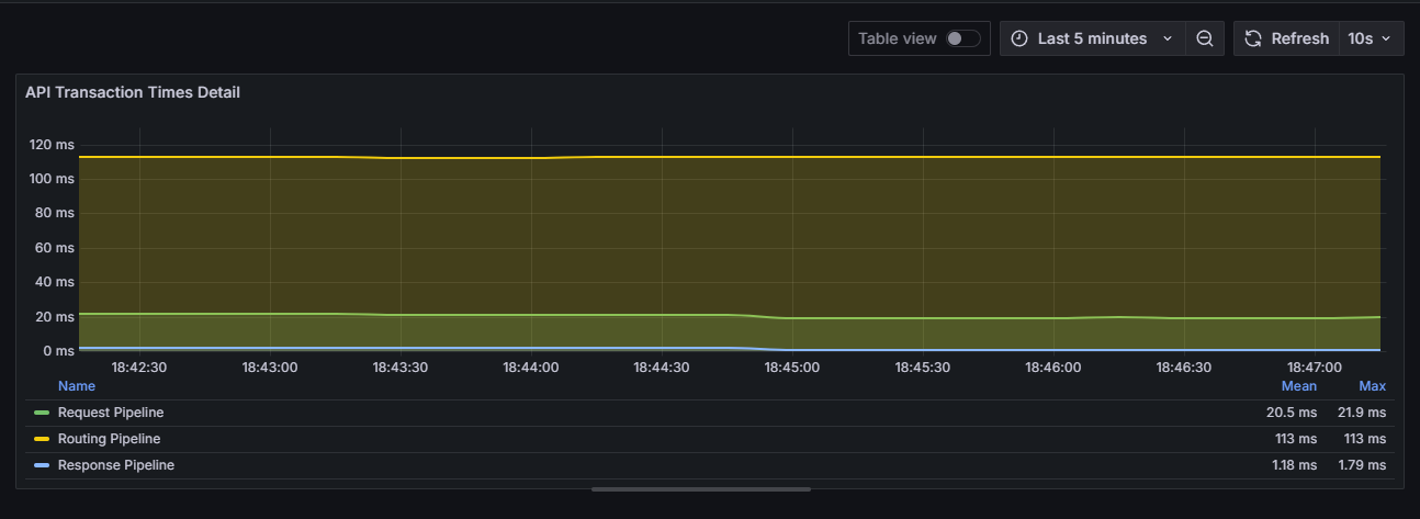 - A: sum(rate(apinizer_api_traffic_request_pipeline_time_seconds_sum[5m])) / sum(rate(apinizer_api_traffic_request_pipeline_time_seconds_count[5m])) * 1000