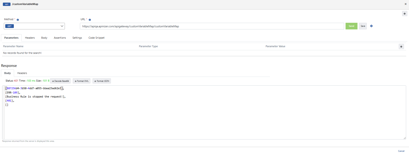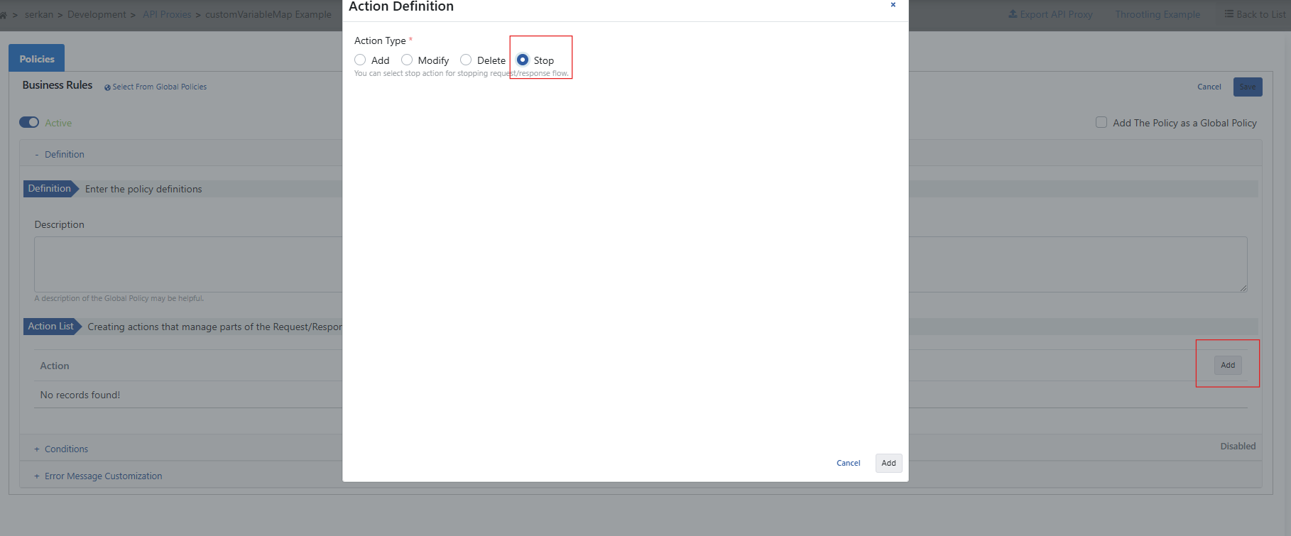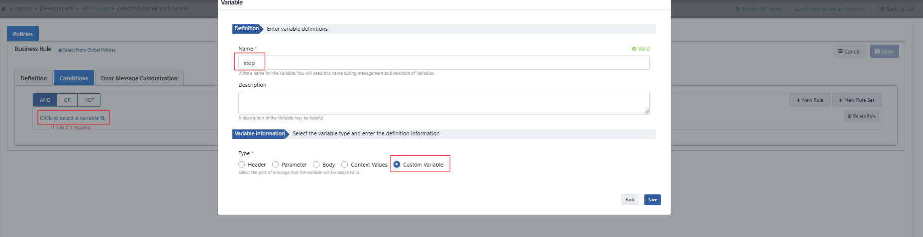 Sonraki aşamada, bir Business Rule politikası eklenerek customVariableMap içindeki değer kontrol edilecektir. Eğer bu değer stop=true ise, isteğin backend'e gitmesi engellenecektir