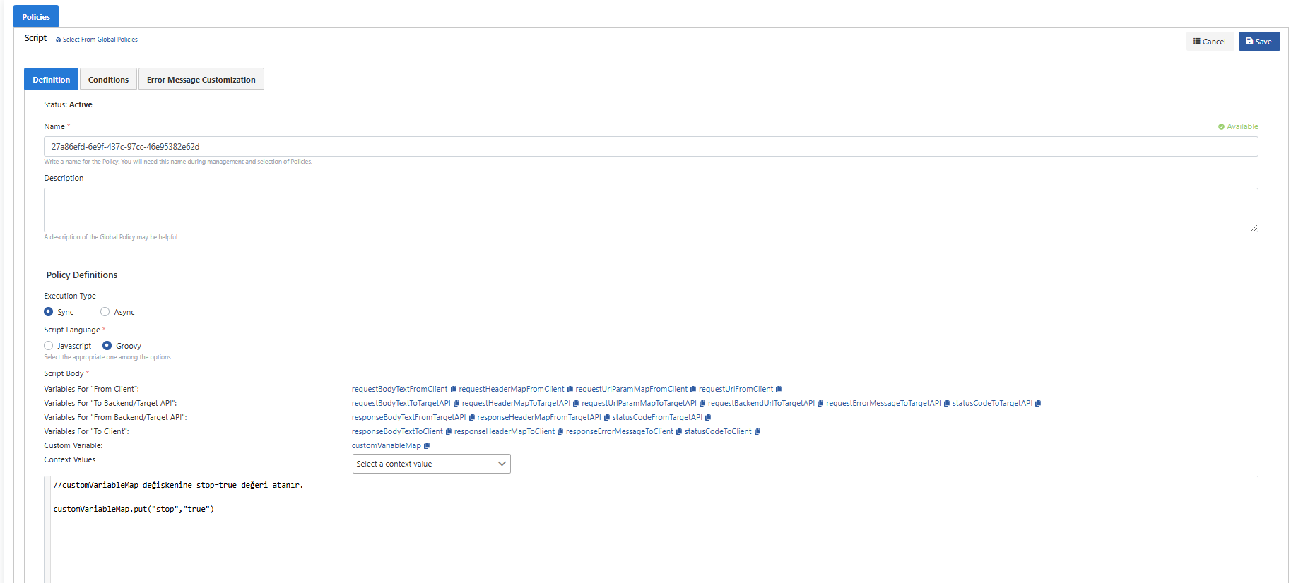 Script politikasında Groovy dilini seçerek, customVariableMap değerine stop=true atanacaktır.