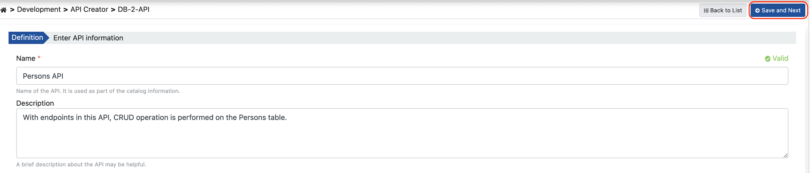 Yeni oluşturulacak API için aşağıdaki alanlar doldurularak sağ üstteki →Kaydet ve Devam (Save and Next) tuşuna tıklanmasıyla API oluşturma işi başlamış olur.