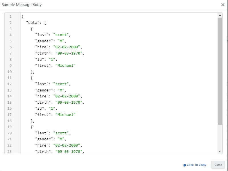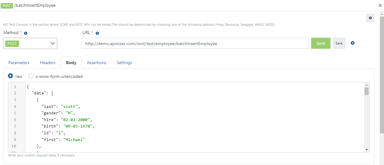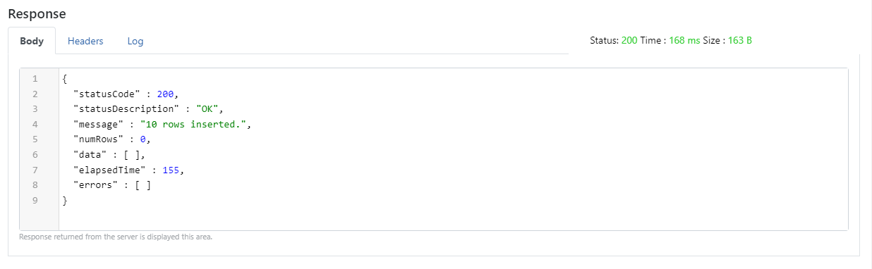 Örnek mesaj gövdesinde de görüldüğü gibi Batch Insert kullanımında veriler bir JSON listesi halinde girilmelidir.