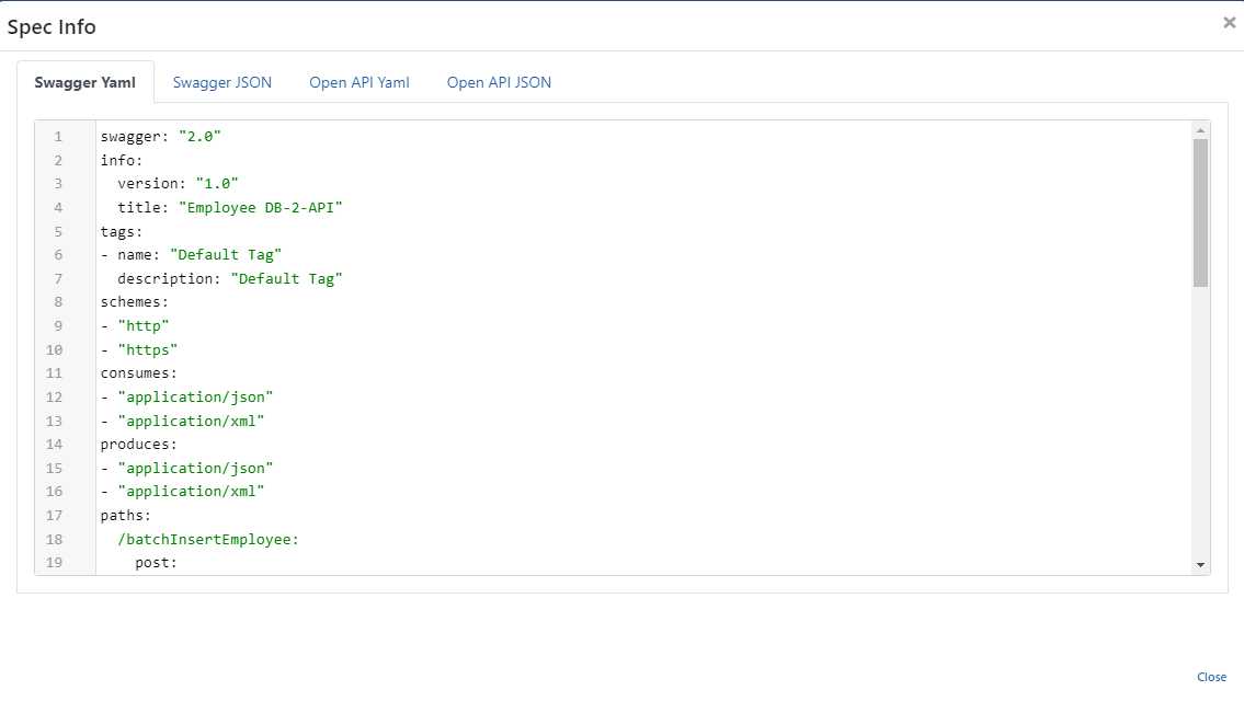 Employee Db-2-API'ye ait API tanım dosyalarına erişmek için Spec'leri Göster (Show Specs) linkine tıklanır.