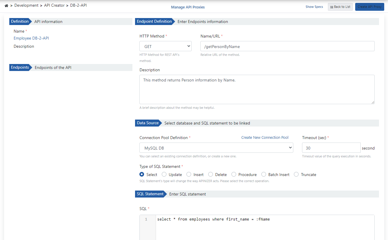 DB-2-API ekranından API Proxy Oluştur (Create API Proxy) butonuna tıklanarak anında API Proxy oluşturulabilir.