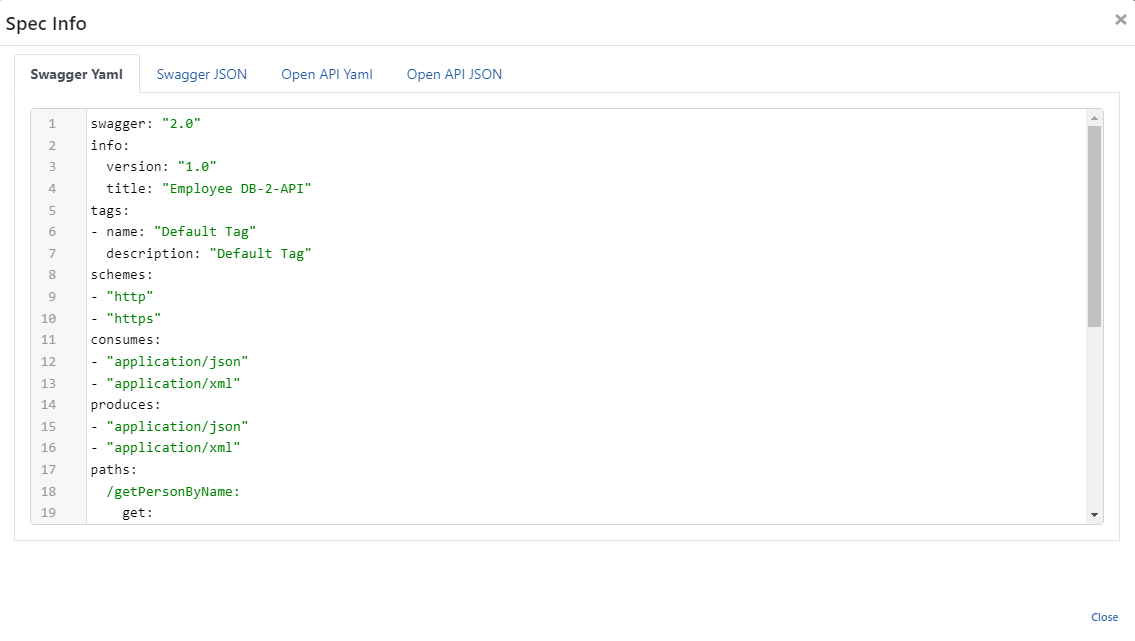 Employee Db-2-API'ye ait API tanım dosyalarına erişmek için Spec'leri Göster (Show Specs) linkine tıklanır.