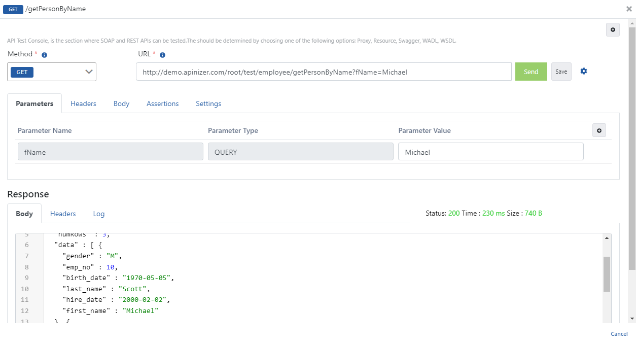 "getPersonByName" metoduna ilgili parametre de verilerek istek gönderildiğinde aşağıdaki yanıt dönmektedir.