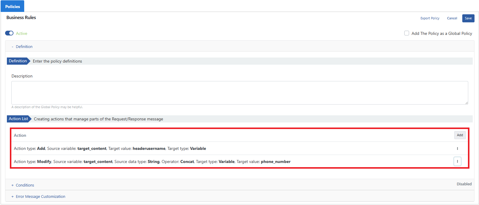 Bussiness Rule politikası ile Custom Variable içine request header alanında gönderilmekte olan kullanıcı adı ve telefon numarası eklenir.