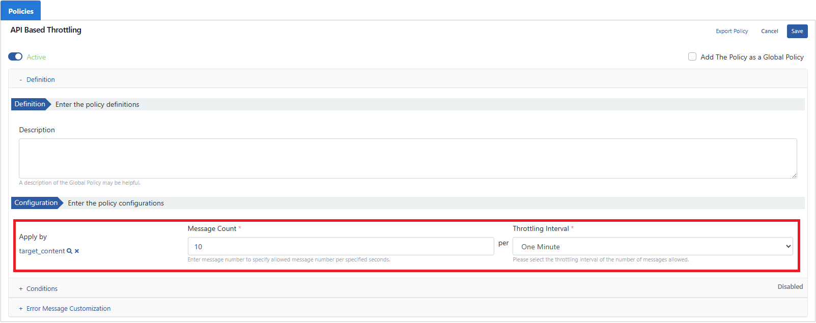 İki değer içeren Custom Variable, API Based Throttling politikası içerisinde Apply by alanından eklenir. Mesaj sayısı ve süresi belirlenir.