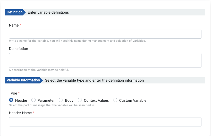 Bu tipte değişken oluşturmak için tip (type) olarak Başlık seçimi yapılarak ilgili girdi alanları doldurulur.
